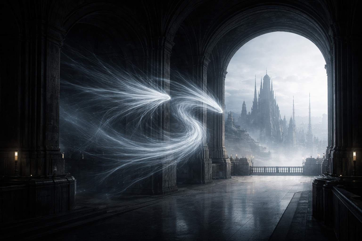 The Dragon moved through the upper halls with a strange and measured grace, its body carrying light not like flame, but like thought made visible. It passed beneath stone arches and along corridors lined with memory tablets and instruments of inquiry, until at last it came to rest upon the great balcony overlooking the city. There, old towers and signal masts stood together against the morning haze, as though one age had not yet fully yielded to the next.